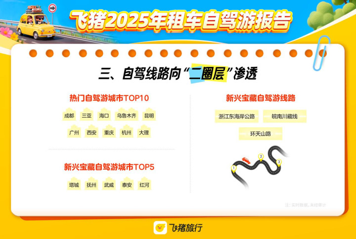 从趋势来看,自驾游正在从热门目的地的热门区域向周边的“二圈层”渗透,报告显示,新疆塔城、江西抚州、甘肃武威、山东泰安、云南红河等地租车单量增速领跑全国。纵观这些城市,均位于热门自驾区域但又并非传统的热门起讫点,景观独具特色且客流车流密度相对较低,是走走停停欣赏窗外山河的天然宝藏目的地。这也反映出自驾游正走向“目的地纵深”和“体验纵深”的格局。自驾游热门线路也反映出同样趋势,数据显示,传统热门的北疆环线、青甘环线、昆大丽线之外,浙江东海岸公路、皖南川藏线、环天山路等成为新兴的自驾游热门区域。